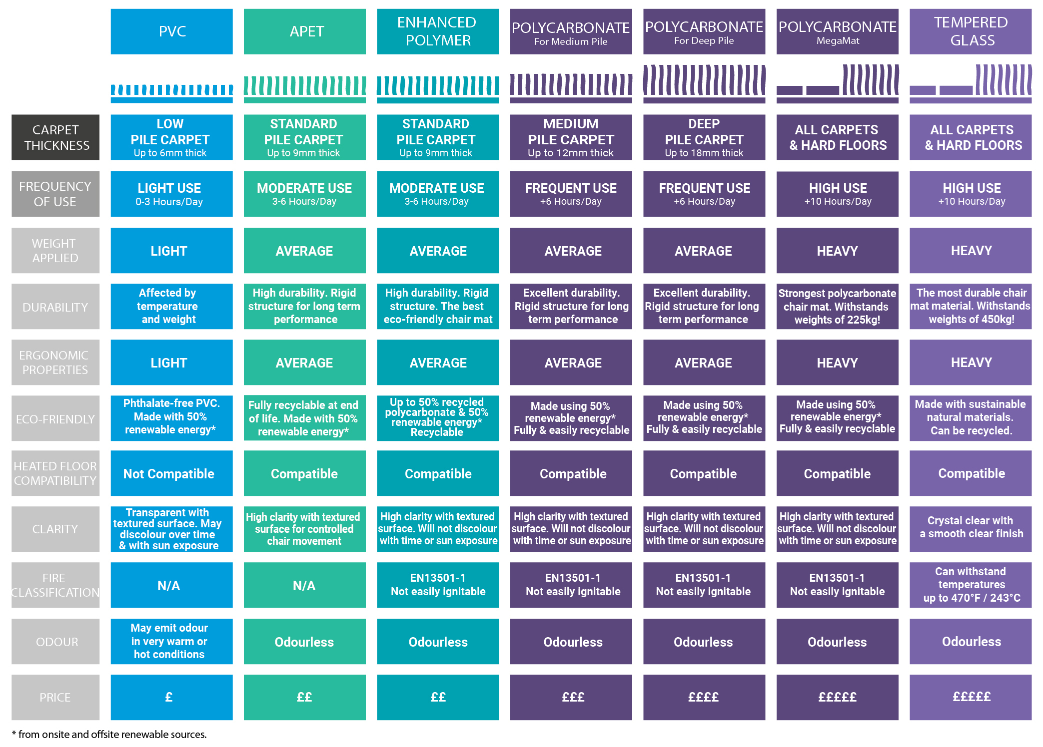 At Mat Stores, we have various chair mat materials available to suit different applications and requirements. Select the chair mat material most suitable for your needs.